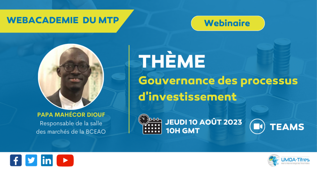 UMOA-Titres a organisé un webinaire de formation sur le thème de la « Gouvernance des processus d’investissement » le jeudi 10 Août 2023 de 10H