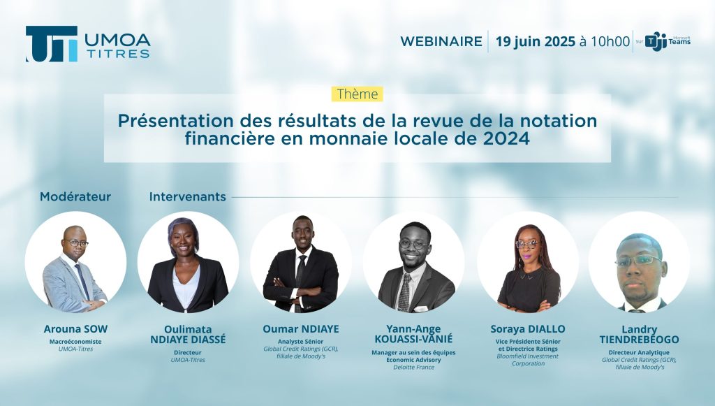 UMOA-Titres organise un panel d’experts sur la notation financière régionale, le jeudi 19 juin 2025 à 10h, en ligne (via Microsoft Teams). La notation financière